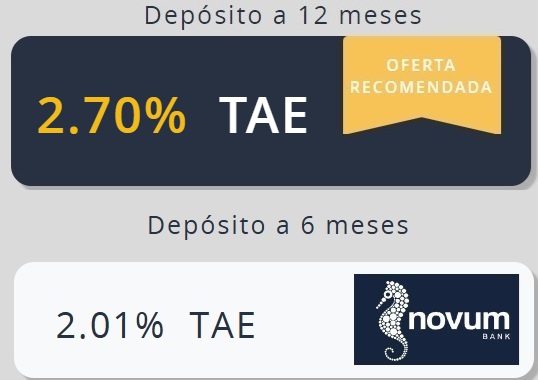 Novum Bank sube la rentabilidad de su depósito a 12 meses de plazo, desde el 2,61% TAE hasta el 2,7% TAE, y mantiene sin cambios el de 6 meses al 2,01% TAE.
