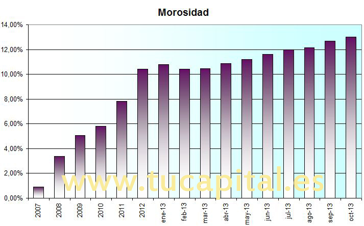La morosidad de los créditos concedidos por los bancos, cajas, cooperativas y establecimientos financieros de crédito (EFC) a particulares y empresas ha escalado hasta el 13% en el mes de Octubre.