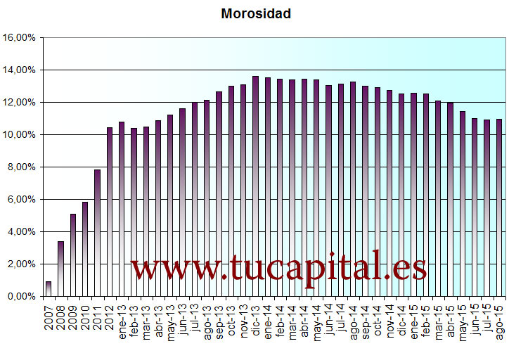 La morosidad de la banca del mes de agosto 2015 sube ligeramente con respecto al mes anterior, rompiendo una serie de 11 meses de bajadas consecutivas, pero sigue por debajo del 11% muy cerca del nivel de abril de 2013.