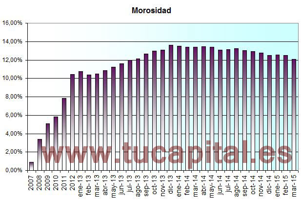 La morosidad de los créditos concedidos por los bancos, cajas y cooperativas a particulares y empresas durante el mes de Marzo de 2015 baja fuertemente en el mes de marzo hasta 12,09%.