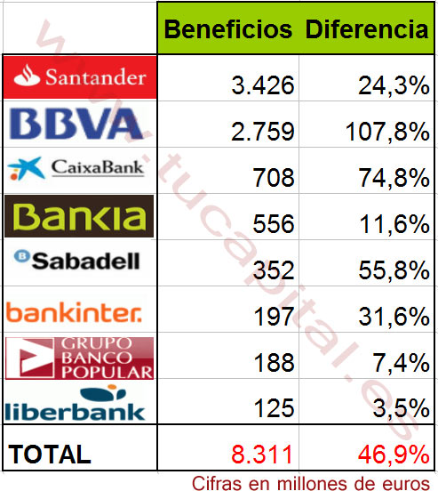 Le sigue BBVA, con 2.759 millones de euros, doblando los resultados de hace 12 meses gracias a las plusvalÃas extraordinarias. Es la entidad que más ha aumentado sus beneficios. Sin los cuales, habrÃa aumentado sus beneficios en un 52,9%.