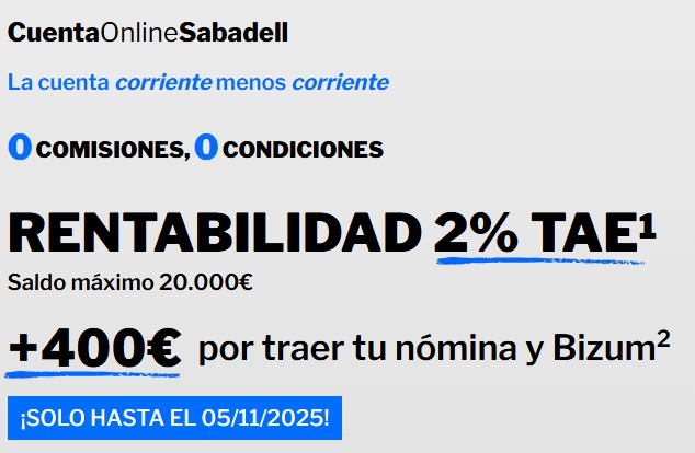 05 de diciembre del 2025 El Banco Sabadell sorprende a todos subiendo la rentabilidad de su Cuenta Online hasta el 2,5% TAE para nuevos clientes, y el límite máximo remunerado desde 20.000€ hasta 50.000€.