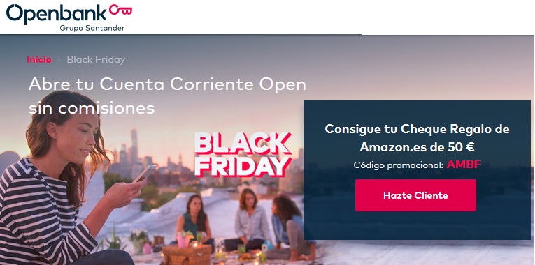 Openbank tiene 2 compañas para el Black Friday: 50€ en cheque Amazon por abrir una cuenta sin comisiones, y te devuelve el 5% de las compras pagadas con la tarjeta de Openbank.