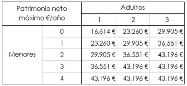 - El patrimonio de la unidad de convivencia debe de ser inferior en función de la siguiente tabla: