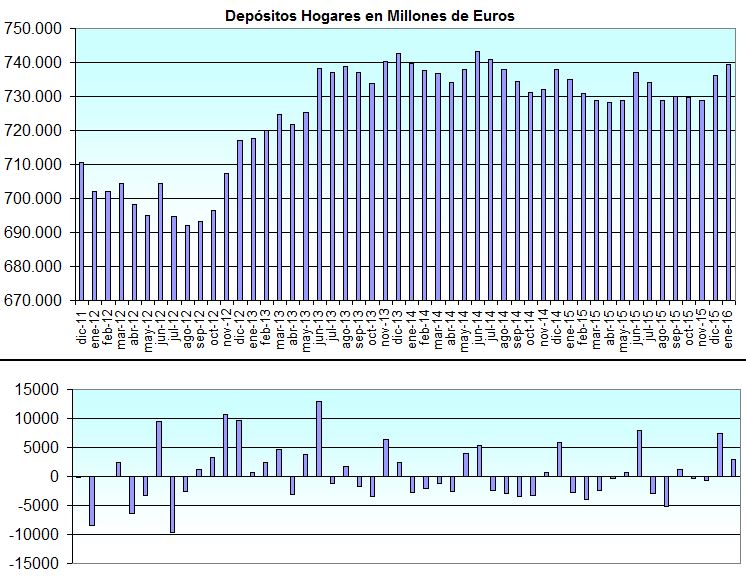 Los bancos han captado en el mes de enero de 2016 de las familias y hogares españolas más de 3.000 millones de euros en depósitos, después de subir en más de 7.000 millones en el mes de diciembre, quedándose muy cerca del máximo histórico de junio de 2014.