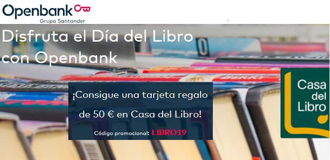Openbank, por motivo del «día del libro«, ofrece un 10% de descuento por las compras en Casa del Libro pagadas con una de sus tarjetas y sortea 4 tarjetas regalo de 50€ en la misma tienda online.