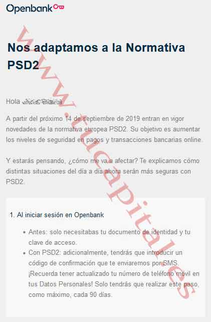 La entidad está enviando un comunicado a sus clientes con el cambio, indicando que será así a partir del día 14 de septiembre cuando entra en vigor la normativa europea PSD2.