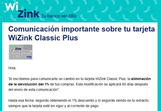 Wizink está comunicando a sus clientes vía email que en el plazo de 60 días desde la recepción de la comunicación eliminarán la devolución del 1% de las compras pagadas con la tarjeta Wizink Classic Plus.