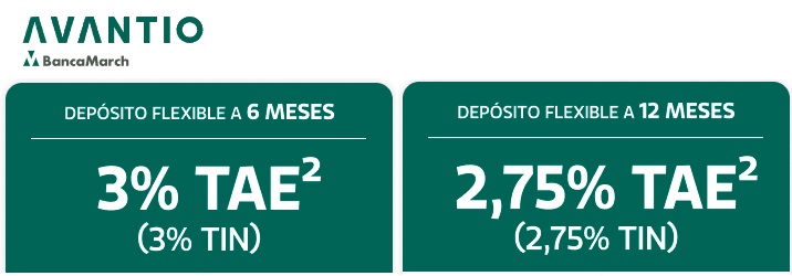 Banca March está ofreciendo su Depósito Flexible Avantio al 2,52% TAE y 2,00% TAE en plazos fijos a 6 y 12 meses respectivamente, solo hasta el 4 de mayo de 2025.