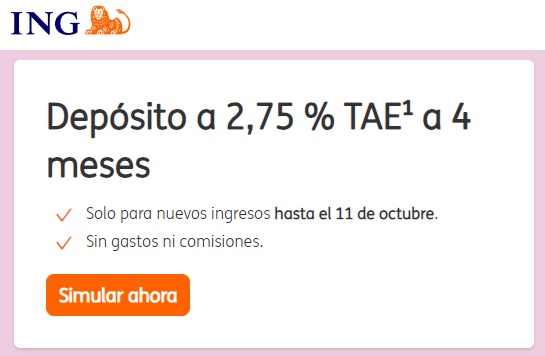 Los clientes del banco ahora tiene la opción de contratar un depósito al 4% TAE y a 3 meses en ING si llevas dinero nuevo al banco.