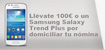 Openbank ofrece en su promoción nómina, 100€ o un Smartphone (Samsung Galaxy Trend Plus) por domiciliar tu nómina, pensión o ingreso periódico.