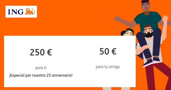 ING ha lanzado el plan amigo «especial por su 25 aniversario» en el que te da 250€ de bienvenida si domicilias tus ingresos en el banco (ahijado) por recomendación de un amigo y cliente del banco (padrino), quien también será bonificado, pero con 50€.