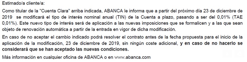 Abanca bajará la rentabilidad de su Cuenta Clara desde el 0,15% TAE hasta el 0,01% TAE a partir del próximo día 23 de diciembre de 2019.