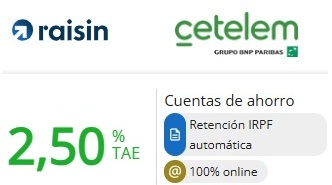 Cetelem, que ofrece su cuenta de ahorro a través de Raisin, ha bajado la rentabilidad desde el 3,1% TAE hasta el 2,5% TAE, lo mismo que ofrece a través de su Plan Premium o Plan VIP Bienvenida.