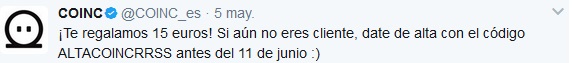 COINC ofrece a través de su Twitter 15 euros a los nuevos clientes que abran una cuenta en la entidad.