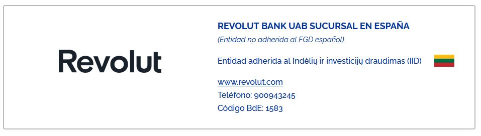 . . . . por favor , leer bien la etiqueta que han puesto » Mejores depósitos bancarios » . . . . la sucursal en España de Revolut Bank esta inscrita en el Regisyro Mercantil de Madrid en el Tomo 44863 , Libro 0 , Folio 1 , Sección 8a , Página M789831 , inscripción 1a y si dirección está en la Calle Serrano 20 , 28001 , Madrid ( España ) . . . . . PERO EL IBAN QUE ME HAN DADO A MI . . . . . LT38 . . . . . IBAN LITUANO . . . . aunque en un plazo de 2 o 3 meses van a migrar a IBAN español . . . . . . . NO ESTA AVALADO POR EL FONDE DE GARANTIA DE DEPOSITOS LITUANO . . . . si no por la empresa State Company Deposit and Investment Insurance de Lituania . . . .la cobertura de este seguro es de 100.000 € por depositante.
