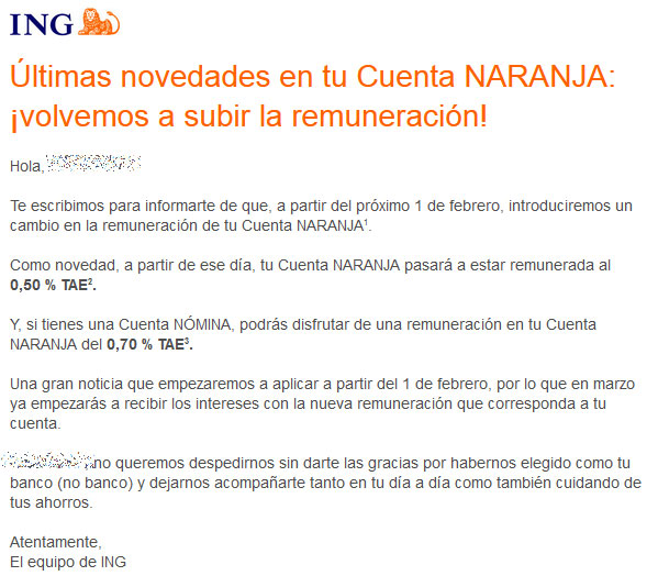 ING comunica a los clientes que a partir del día 1 de febrero las cuentas Naranjas de la entidad se remunerará al 0,5% TAE.