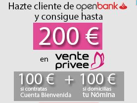 Openbank está ofreciendo 100€ en efectivo como hemos informado ayer, pero si quieres más, puedes obtener 200€, eso sí, en cheque regalo de la tienda virtual, vente-privee.com, si domicilias tu nómina en la entidad.