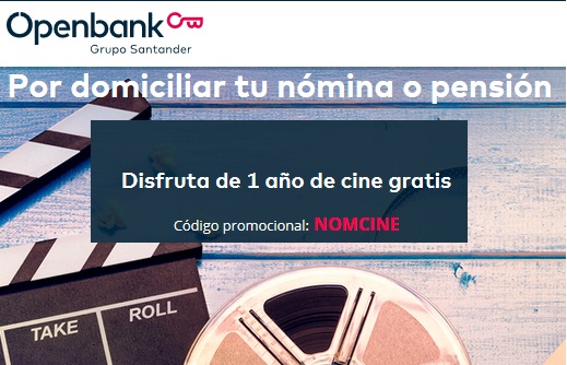 Nada más acceder a las promociones de Openbank puedes leer en uno de sus banners: disfruta 1 año de cine gratis al domiciliar tu nómina o pensión.