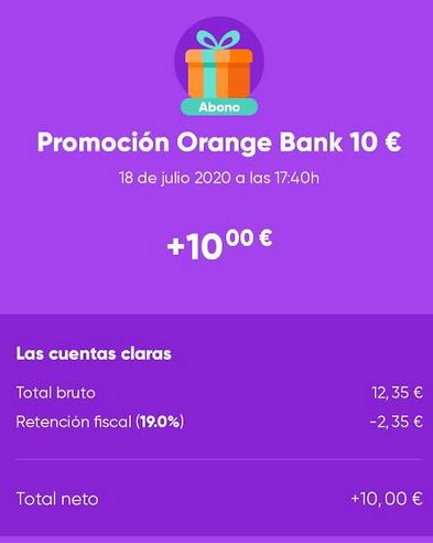 La bonificación es libre de impuestos (después de retenciones) que el banco te ingresa en tu cuenta de Orange Bank después de cada pago y en un plazo máximo de 48 horas hábiles.