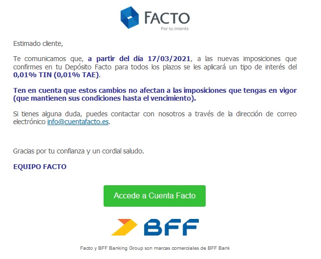 Supongo que eso significa que BFF se retira de España en menos de un año. Porque si un banco tiene una cuenta (=Facto) que se dedicaba a ofertar depósitos interesantes y por eso tenía clientes, ahora que ya no oferta nada de interés para los clientes, lógicamente se irán marchando según vayan cancelando los depósitos. ¿O es que prepara otro tipo de negocio en España?