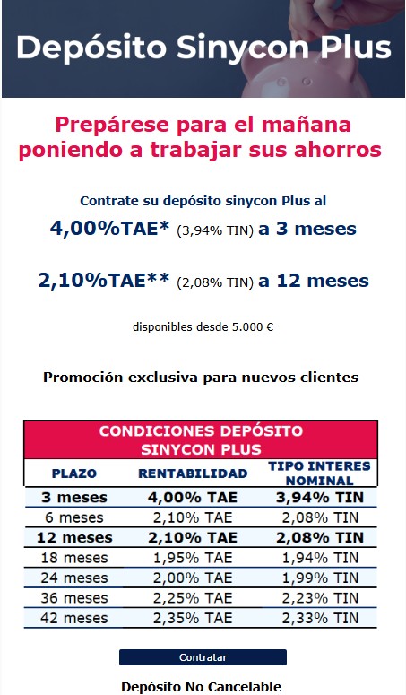 EBN Banco lanzará mañana un depósito al 4% TAE a 3 meses de plazo para nuevos clientes, el «Depósito SinyCon Plus»·