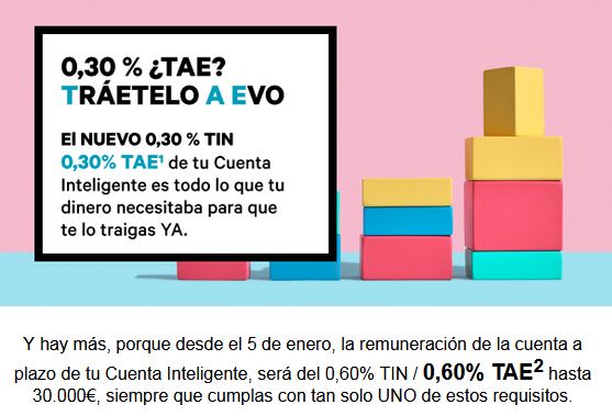 Evo Banco subió, el pasado 5 de enero de 2023, la rentabilidad de su cuenta de Ahorro hasta el 0,6% TAE, desde el 0,2% TAE.