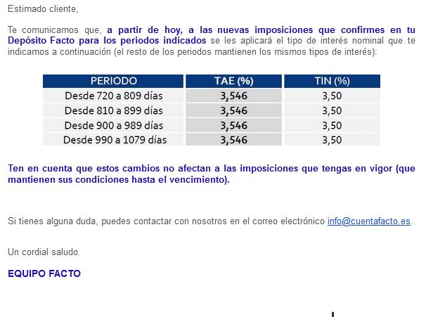 Facto pone al 3,55% TAE los depósitos de 720 días a 1079 días de plazo (2 a 3 años).