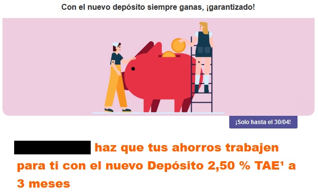 De esta manera, está comunicando a sus clientes vía email con la nueva oferta, que es menos rentable (2,5% frente al 2,75% TAE del mes de febrero) y por menos tiempo (3 meses frente a 4 meses).