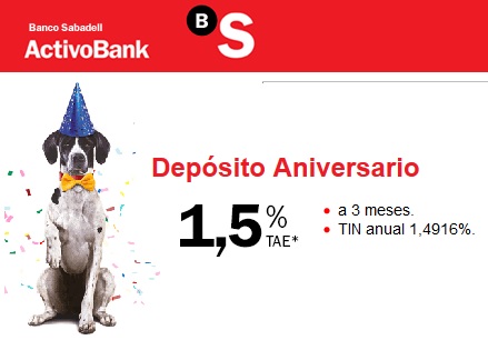 Activo Bank segue ofreciendo su depósito Aniversario, al 1,5% TAE hasta el 30 de septiembre de 2016.