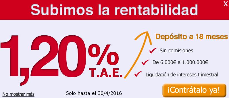 El Banco Popular-e sigue ofreciendo durante el mes de abril sus depósitos bancarios de hasta 1,15% TAE cuyo plazo de comercialización terminaba el 31 de marzo de 2016.