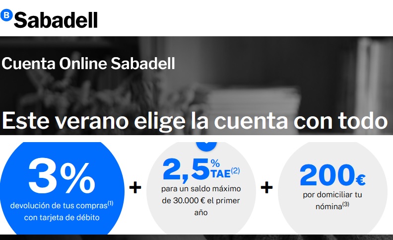 El Banco Sabadell ha prorrogado nuevamente la oferta de su cuenta online con una rentabilidad de 2% TAE para nuevos clientes y una bonificación extra de 175€ en efectivo si además domicilias la nómina hasta el 15 de marzo de 2023.