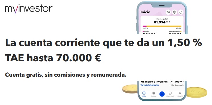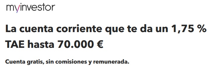 MyInvestor ha bajado al inicio del mes de febrero la rentabilidad inicial de su cuenta corriente para los nuevos clientes desde el 1,75% TAE hasta el 1,5% TAE durante los primeros 12 meses.