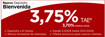 Mejora de esta manera su ya excelente depósito al 3.75% TAE a un plazo de 6 meses que venía comercializando, que por cierto también lo ha subido de rentabilidad, hasta el 4% TAE.
